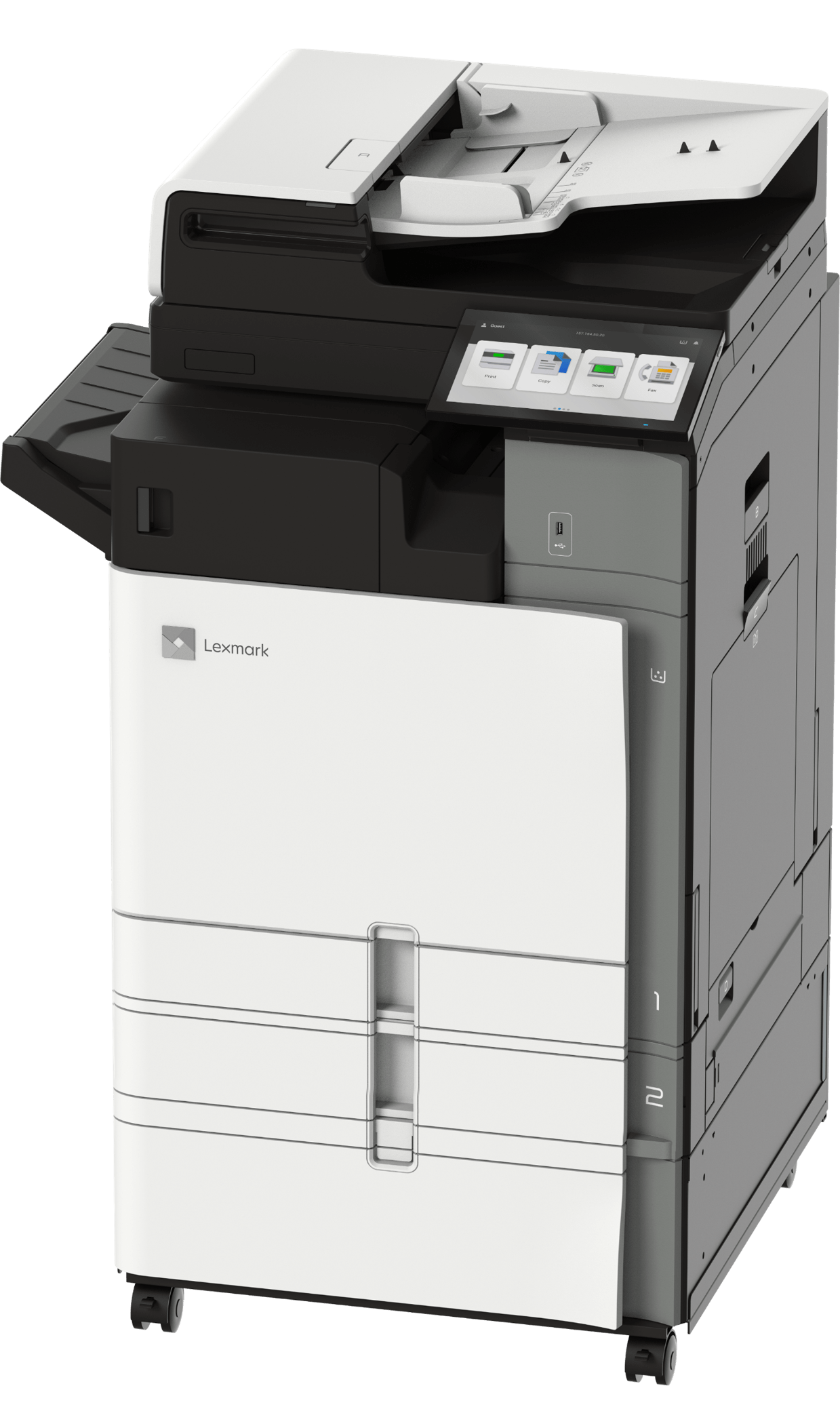 Bandeja de 500 hojas, 2 × bandejas de 550 hojas, alimentador doble de 2.000 hojas, bandeja de alta capacidad de 1.500 hojas, bandeja para soportes especiales, distintas unidades de acabado y opciones de muebles/soportes